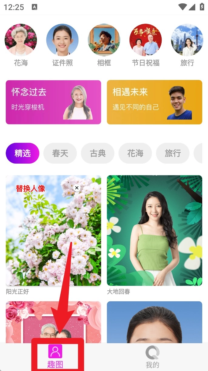 1. 打开App进入首页,点击底部趣图标签页可浏览花海等模板分类,点击任意模块进入制作界面。