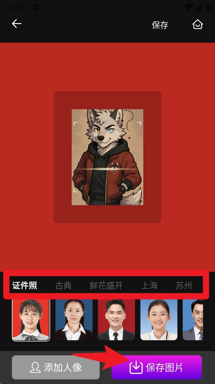 2. 在证件照模板下选择合适背景,上传个人头像后自动抠图并嵌入新背景,可直接点击保存图片进行。
