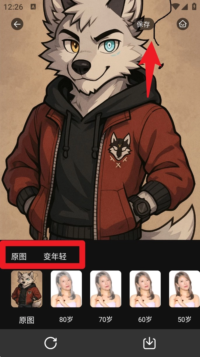 3. 进入变年轻功能区后,上传图像即可切换为不同年龄段样貌,包含80岁至20岁等多个变化可供预览和保存。