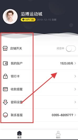 进入我的页面后,你可以通过操作店铺开关来查看自己的账户余额,此外还支持管理银行卡、设置收款提醒、修改密码以及联系客服等功能,以此保障店铺的正常运营。