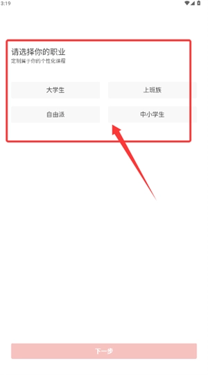 1、进入应用后,在职业选择页面勾选学生或职场人等身份并点击下一步。