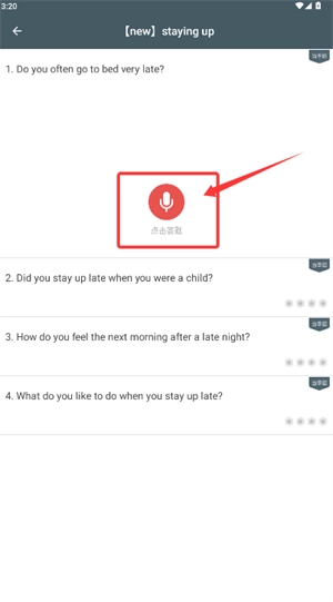 3、在测试题目界面点击麦克风图标,根据提示完成口语问答录制。