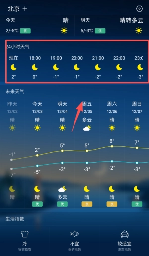 2 上滑页面或者查看24小时预报,就能知晓今日每个小时的天气变动,方便大家规划出门的时间。