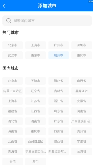 3、今日新增城市选择界面,支持直接搜索国内城市,也可从下方展示的城市列表中直接选取。