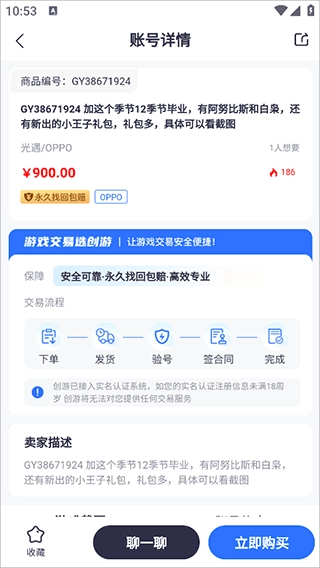 4、如果对交易流程或游戏账号信息还要进一步了解可以点击【聊一聊】,与交易对方进一步沟通