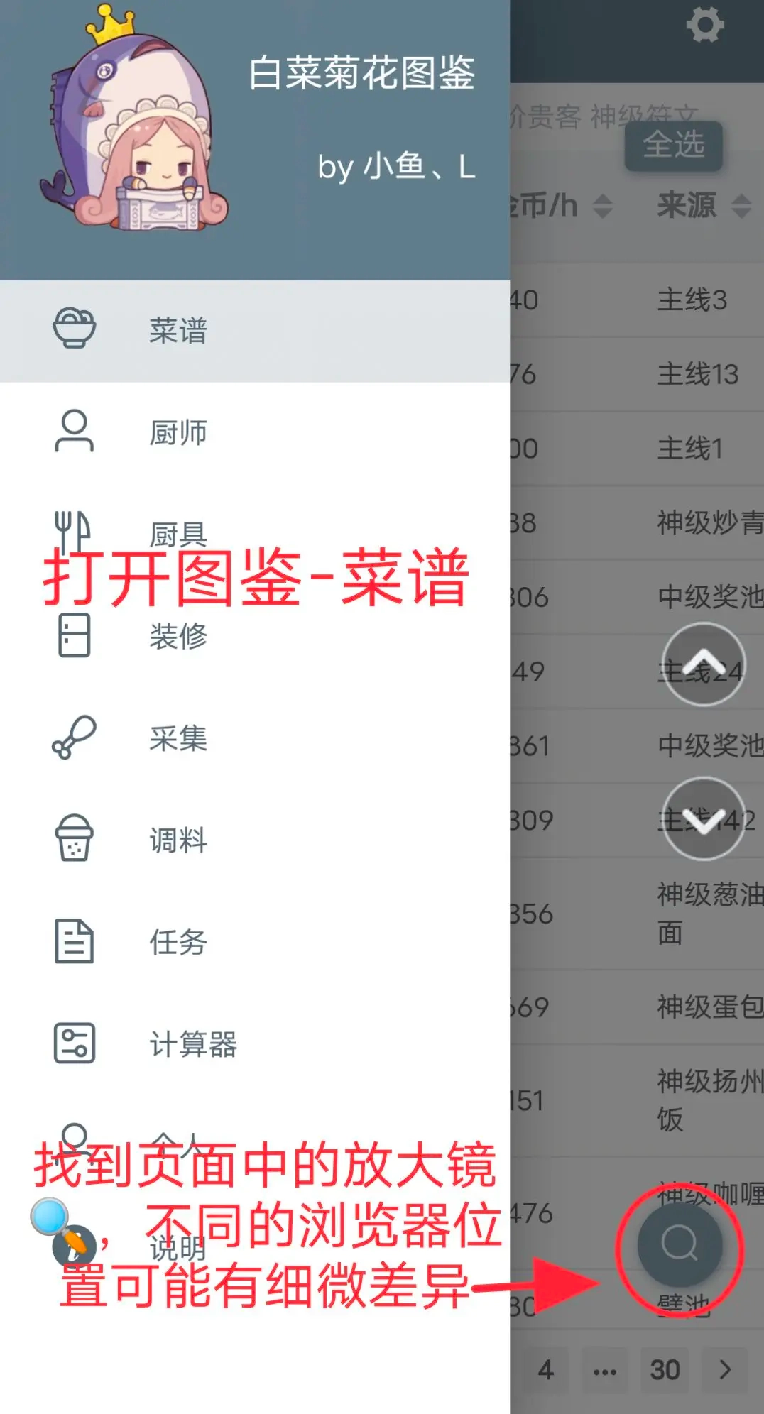 接下来,我将简单介绍一下如何录入自己的菜谱、厨师和修炼加成。首次录入时,我个人建议对照游戏内的图鉴编号一个一个录入,这样不容易漏掉。打开白菜菊花菜谱栏,点击放大镜,在展示列选上“已有”和“编号”,这样菜谱后面就有一个可以打勾的地方。对照自己的图鉴,一个一个勾选即可快速录入,无需自己思考。
