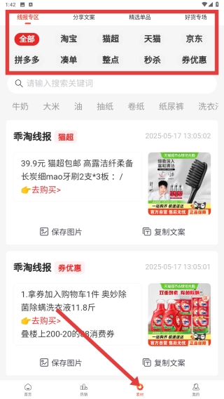 3、选品页面,有热门专区等分类,展示猫超、京东等平台商品,提供购买、文案复制等功能。