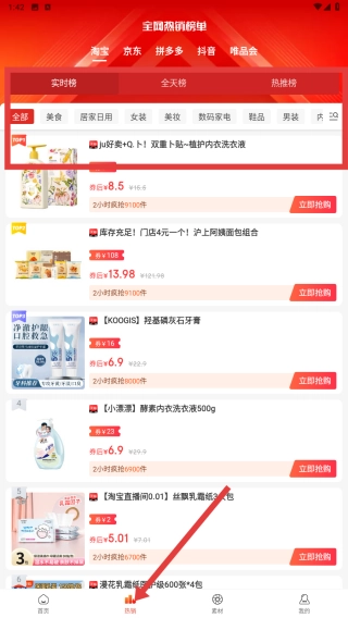 2、全球热卖榜单页面,按实时榜、全天榜等展示商品,涵盖多品类,可查看优惠商品并抢购。