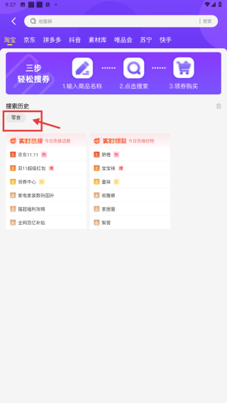 2、在优惠页面的搜索历史里,点击零食选项,查看零食商品列表。