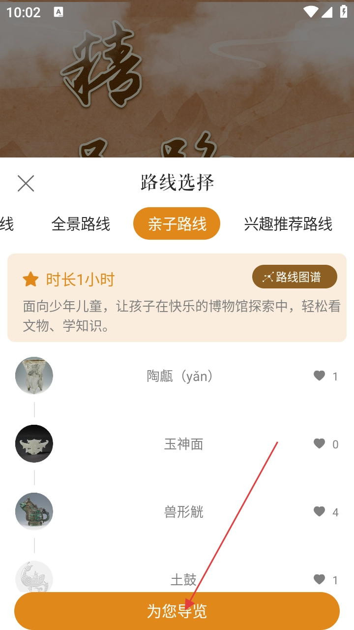 3、选【亲子路线】,适合少年儿童,能在快乐探索中看文物、学知识,选好后点【为您导览】开启。