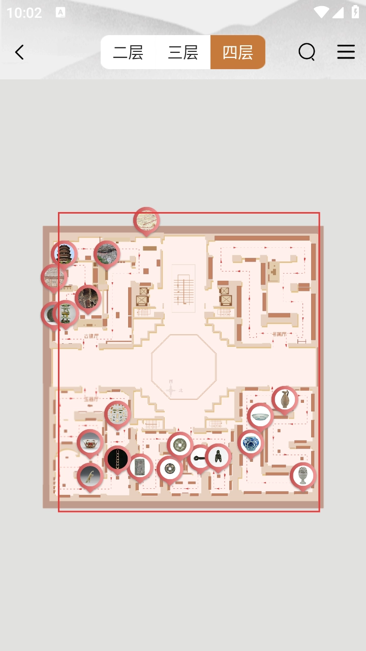 4、查看四层展厅布局图,图中标记了各类展品位置,可借助它规划四层的参观路线。