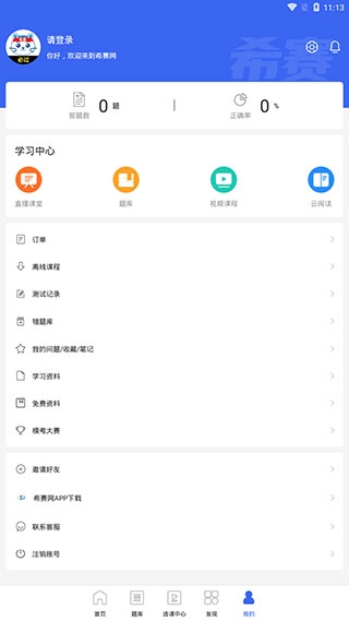 5、【我的】页面呈现的是用户账号主体的部分基础信息,涵盖学习中心、笔记资料、答题记录等内容,此外还包含软件的相关设置。