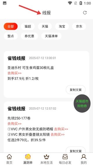 2、点线报页,展示各类省钱线报,如鸡蛋礼盒、防晒帽优惠信息,可复制文案,还有平台购物券领取。