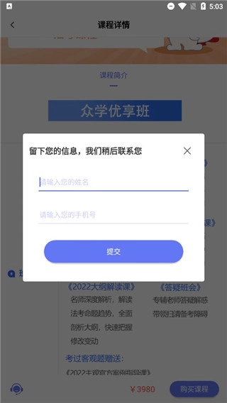 4、若您决定购买,点击下方的【购买课程】按钮,填写您的真实信息后点击【提交】就可以了。