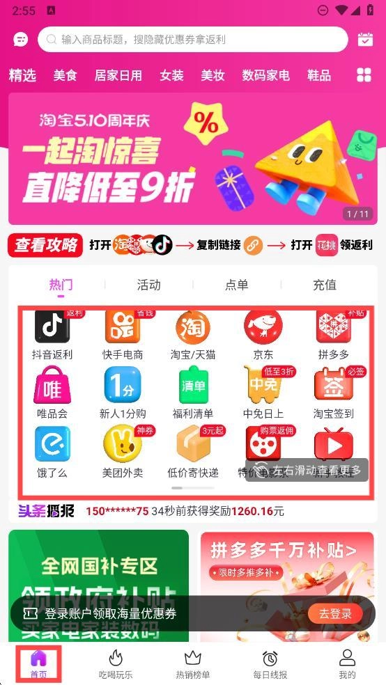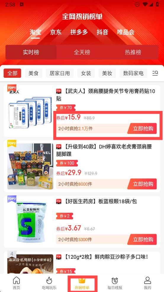 2、点击下方中间的按钮,就能进入热销榜单界面;在这个界面里,你可以看到五大热门平台的优惠商品,并且能够直接进行抢购。