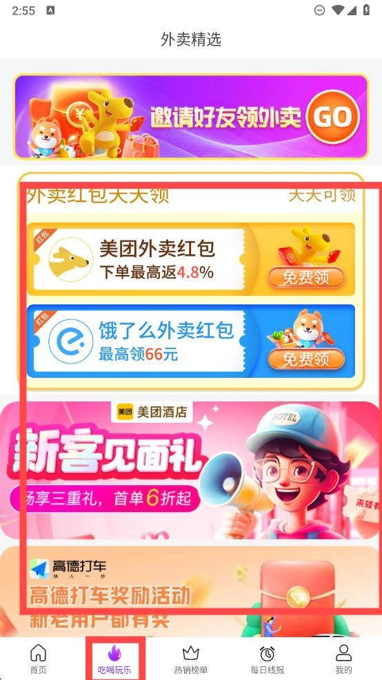 3、点击“吃喝玩乐”按钮,在这里可以领取外卖平台的优惠券,还能参与酒店、打车等各类优惠活动。