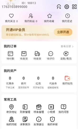 4、接着进入个人中心菜单界面,找到“常用工具”板块下方的“收货地址”功能按钮并点击进入。