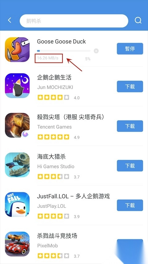 3、这里以鹅鸭杀游戏为例,在上方搜索栏输入“鹅鸭杀”即可在下方查看该游戏的评分以及厂商信息,点击一键即可。