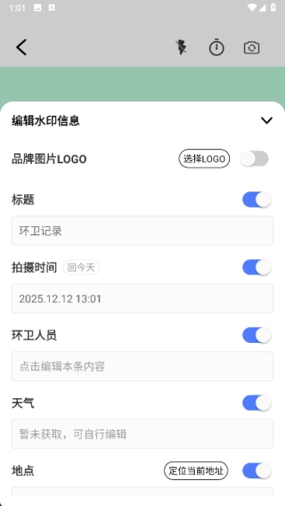 3、点击水印可以进入到编辑的页面中选择LOGO,然后输入标题、拍摄时间、环卫人员、天气以及地点等信息;