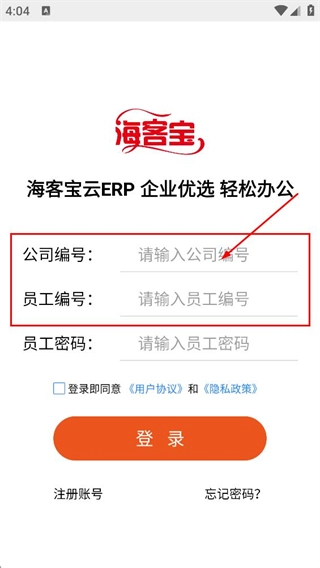 1、在海客宝云ERP的服务协议与隐私条款弹窗里,点击同意按钮,即可进入登录页面。