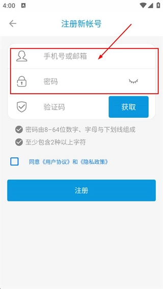 2、进入注册新账号页面后,填写手机号或邮箱以及密码,再开展后续操作。