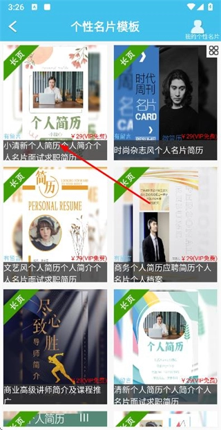 2、在个性名片模板页面找到目标模板并点击,即可进入该模板的详情页面。
