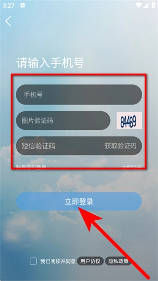 4、填写手机号码,输入收到的验证码,勾选相关协议,点击“立即登录”按钮,即可完成登录操作。