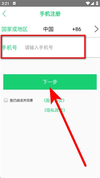 4、进入手机注册界面后,填写手机号并勾选相关协议,随后点击“下一步”按钮。