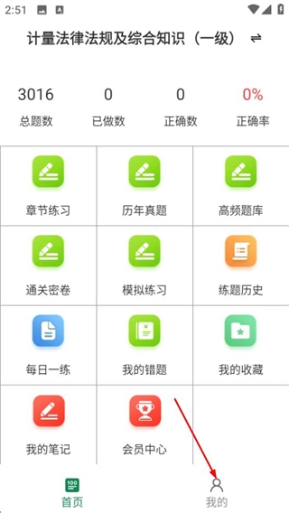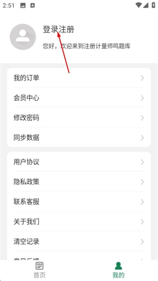 1、在注册计量师鸣题库的首页,点击底部的“我的”选项,即可进入个人中心页面。
