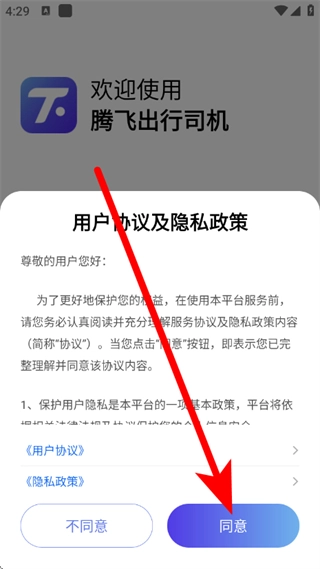 1、启动腾飞出行司机应用,待弹出提示框后点击“同意”,即可进入手机号填写界面。