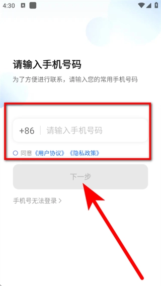 2、进入手机号页面后,先输入手机号码,接着勾选相关协议,再点击下一步按钮。