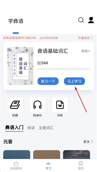 2、进入学彝语页面后,找到彝语基础词汇板块,点击该板块内的“马上学习”按钮,即可进入对应的学习页面。