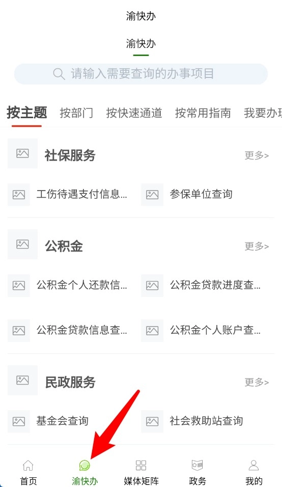 2、渝快办页面支持社保、公积金、民政等便民事项查询,功能分类清晰易用。