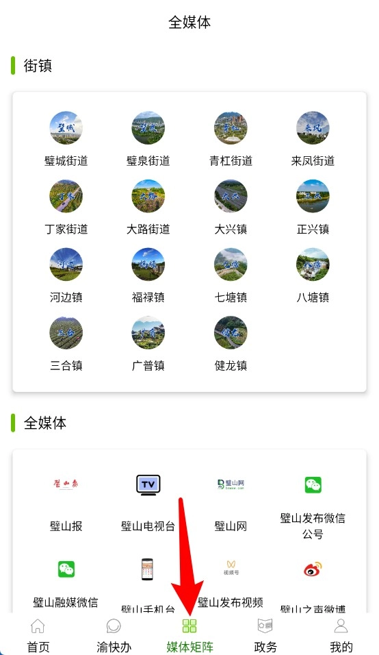 3、媒体矩阵板块集成街镇内容与本地媒体资源,方便查看多渠道新闻资讯。