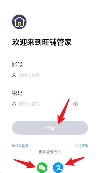 1、打开旺铺管家安卓版,输入账号密码或通过微信、支付宝快捷登录进入系统首页。
