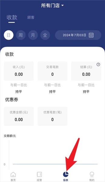 4、点击“报表”栏目,可查看每日收入、交易笔数、优惠券等数据的统计图表。