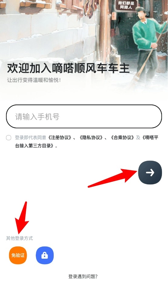 1、打开页面后输入手机号并勾选协议,再点击箭头按钮即可快速注册成为嘀嗒顺风车车主。