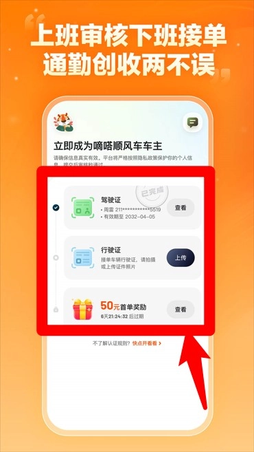 3、上传驾驶证和行驶证完成认证流程,新车主注册成功还可领取首单奖励金激励。