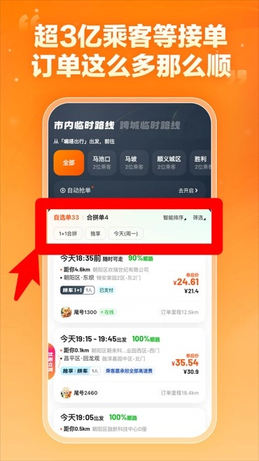 4、系统根据路线实时推送订单,支持查看待接订单和合单情况,轻松接单赚油费。