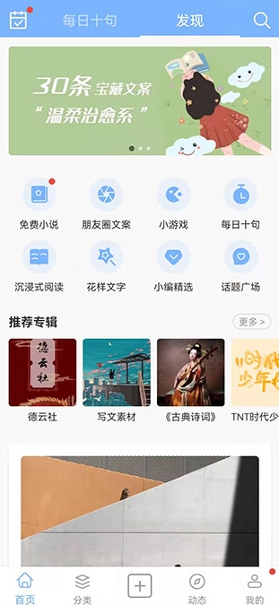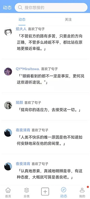 5、用户在动态中可以随时随地的去发布句子,并且这里有很多跟你一样喜欢发句子的朋友,你还可以尝试与他们交流。