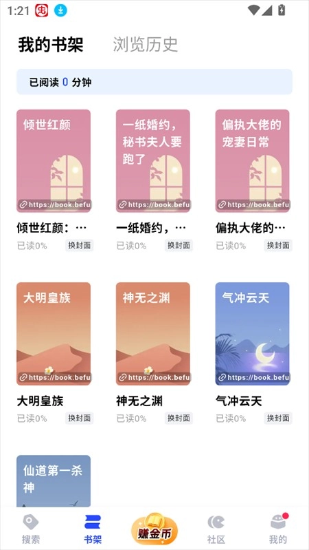 2、在书架界面下,我们可以收藏一系列小说,这样一来就能够及时获取到最新的小说更新章节。