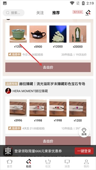 2、进入拍卖页面后,找到你想要参与的拍卖专场,点击该专场下方的【去出价】按钮即可。