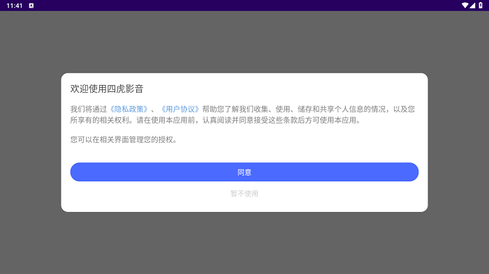 欢迎使用四虎影库:我们会借助《隐私政策》与《用户协议》,让您清楚我们对个人信息进行收集、使用、储存和共享的具体情况,还有您拥有的相关权利。请在使用本应用之前,仔细阅读并同意接受这些条款,之后才能使用本应用。您可以在对应的界面管理自己的授权。点击同意按钮。