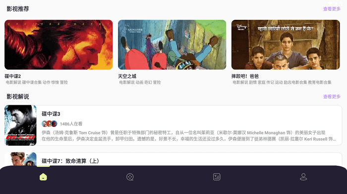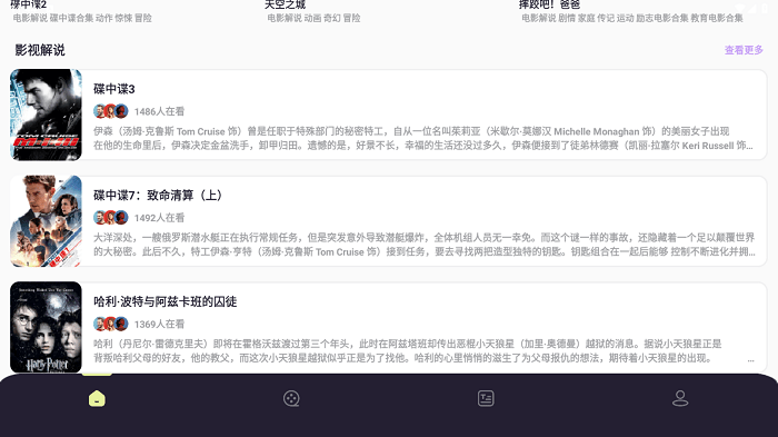 您也可以向下滑动屏幕,浏览影视解说;要是想了解更多内容,点击右侧的紫色“查看更多”按钮就行。
