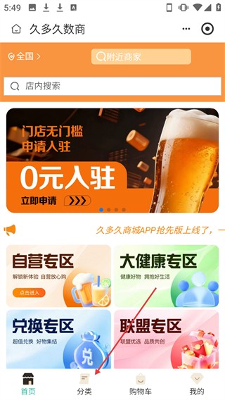1、在久多久数商首页点击底部的【分类】选项,可进入商品分类页面。