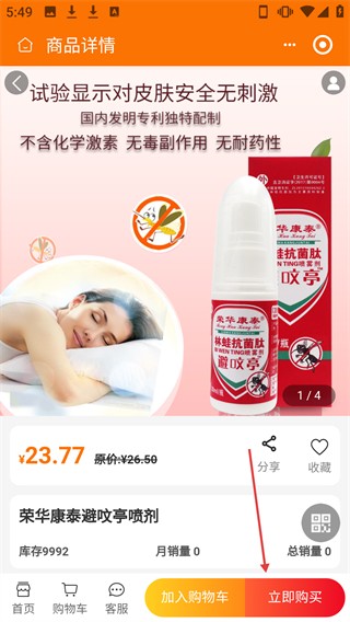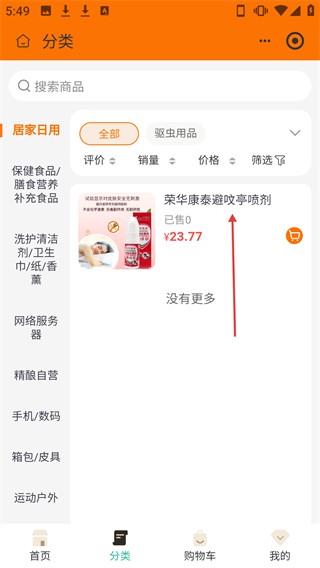 2、在分类页面点击【荣华康泰避咬亭喷剂】对应的商品卡片,可进入该商品的详情页面。