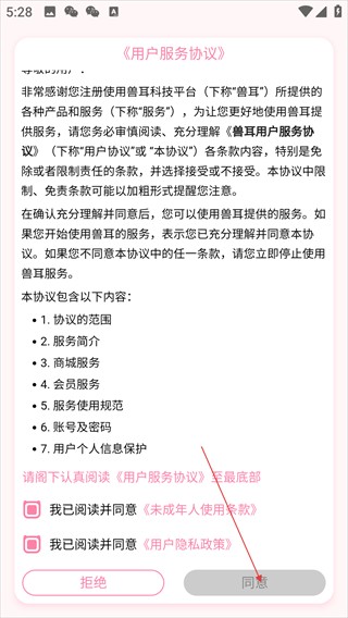 1、阅读《用户服务协议》,勾选“我已阅读并同意《未成年人使用条款》”“我已阅读并同意《用户隐私政策》”,点击【同意】按钮确认协议。