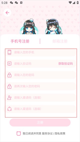 3、在手机号注册表单中,依次填写手机号、获取并输入验证码、设置并确认密码,选填邀请码、渠道码。