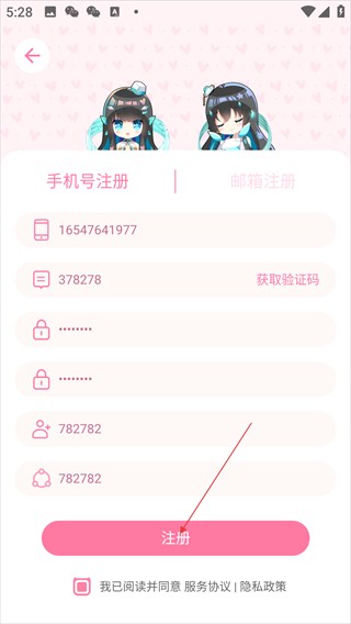 4、勾选“我已阅读并同意服务协议|隐私政策”,点击【注册】按钮,完成账号注册。