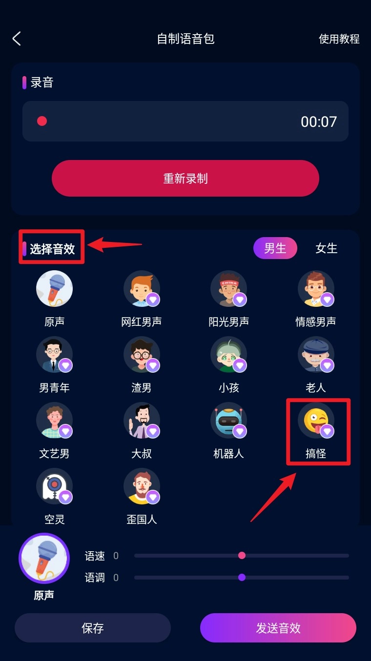 3. 录音结束后,可挑选你偏好的变声音效,像搞怪、机器人这类都可以。